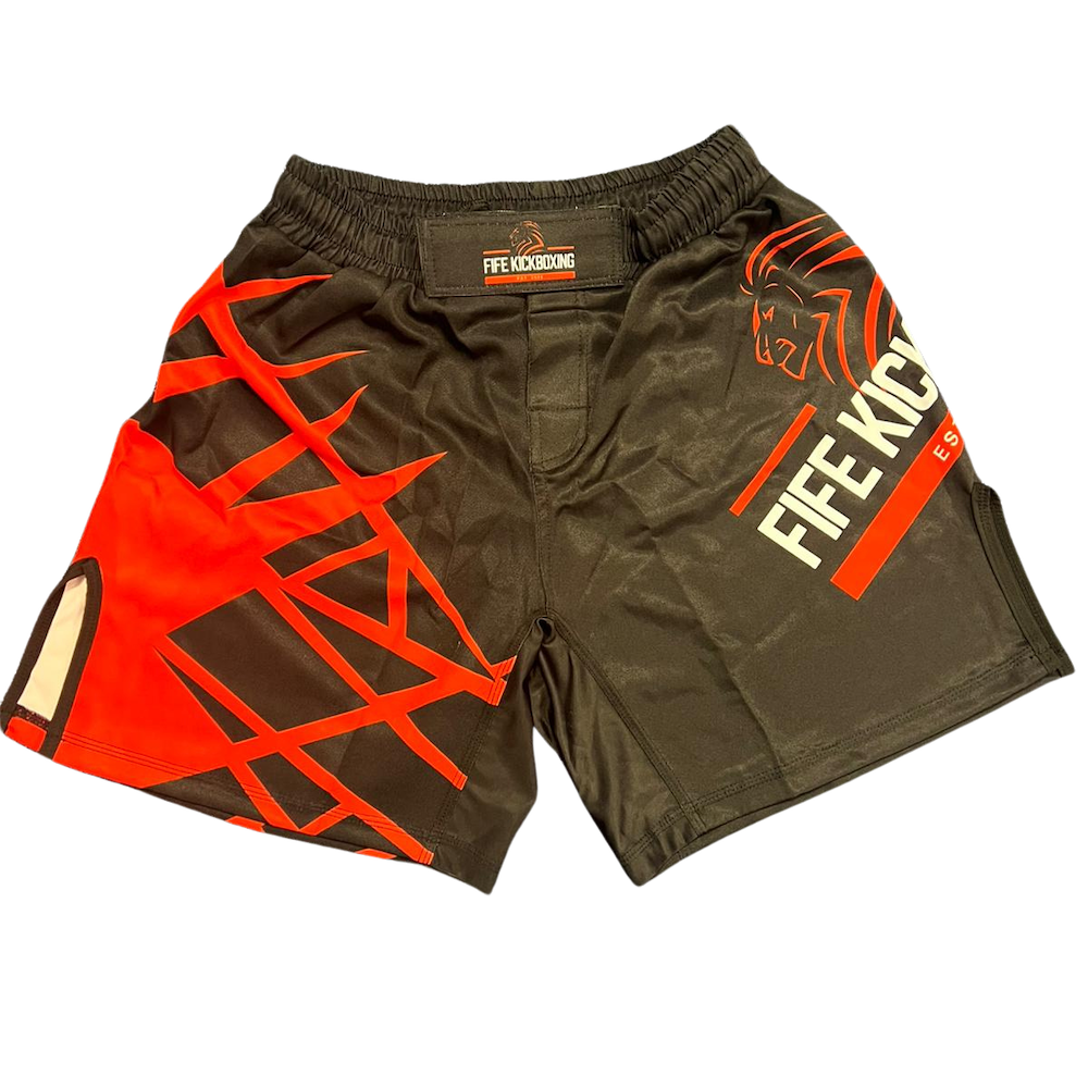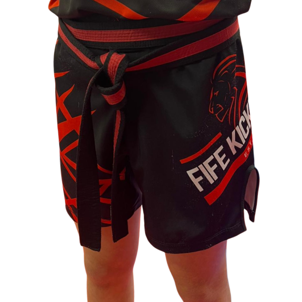 Black, red & white with Fife Kickboxing logo on left leg.